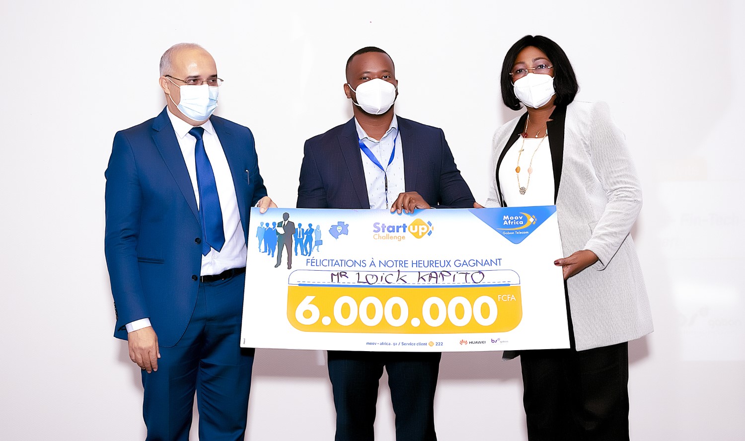 Junior Minso (au centre), Responsable du Développement Commercial de POZI a reçu des mains du Directeur Général de Moov Africa Gabon Telecom et de la Ministre Délégué à l’Economie Numérique, Mme Gisèle Akoghe, le 2nd Prix du Startup Challenge 2021